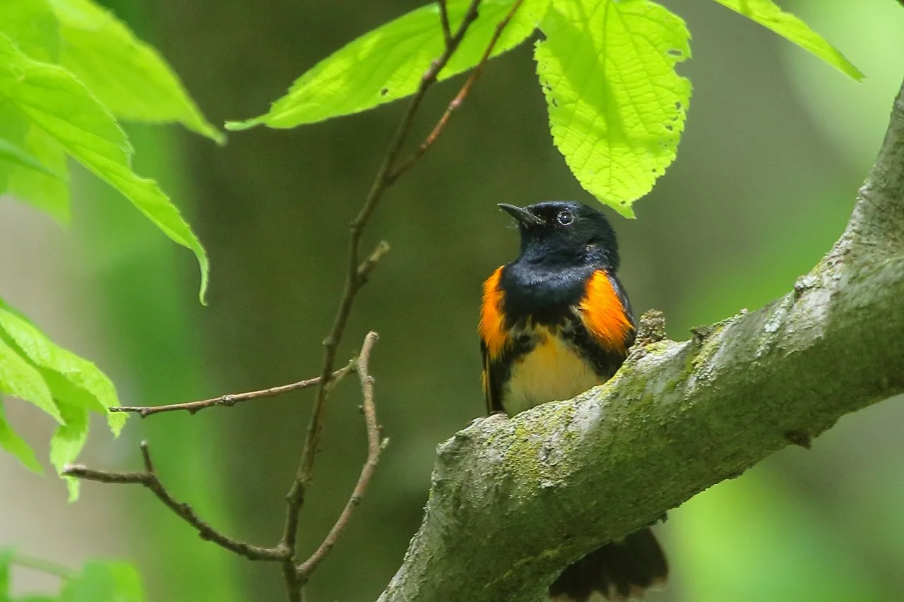But since they’re in our area now, let’s try to find them. Where should we look? American Redstarts prefer wooded stream corridors and other woodlands near water. I’ve frequently found them at Meadowbrook Park, Crystal Lake Park, and even in my own backyard. While I wouldn’t call where I live a “woodland,” we do have mature trees nearby, as well as an old crabapple tree and an artificial waterfall. But these are just the places I tend to look for warblers.